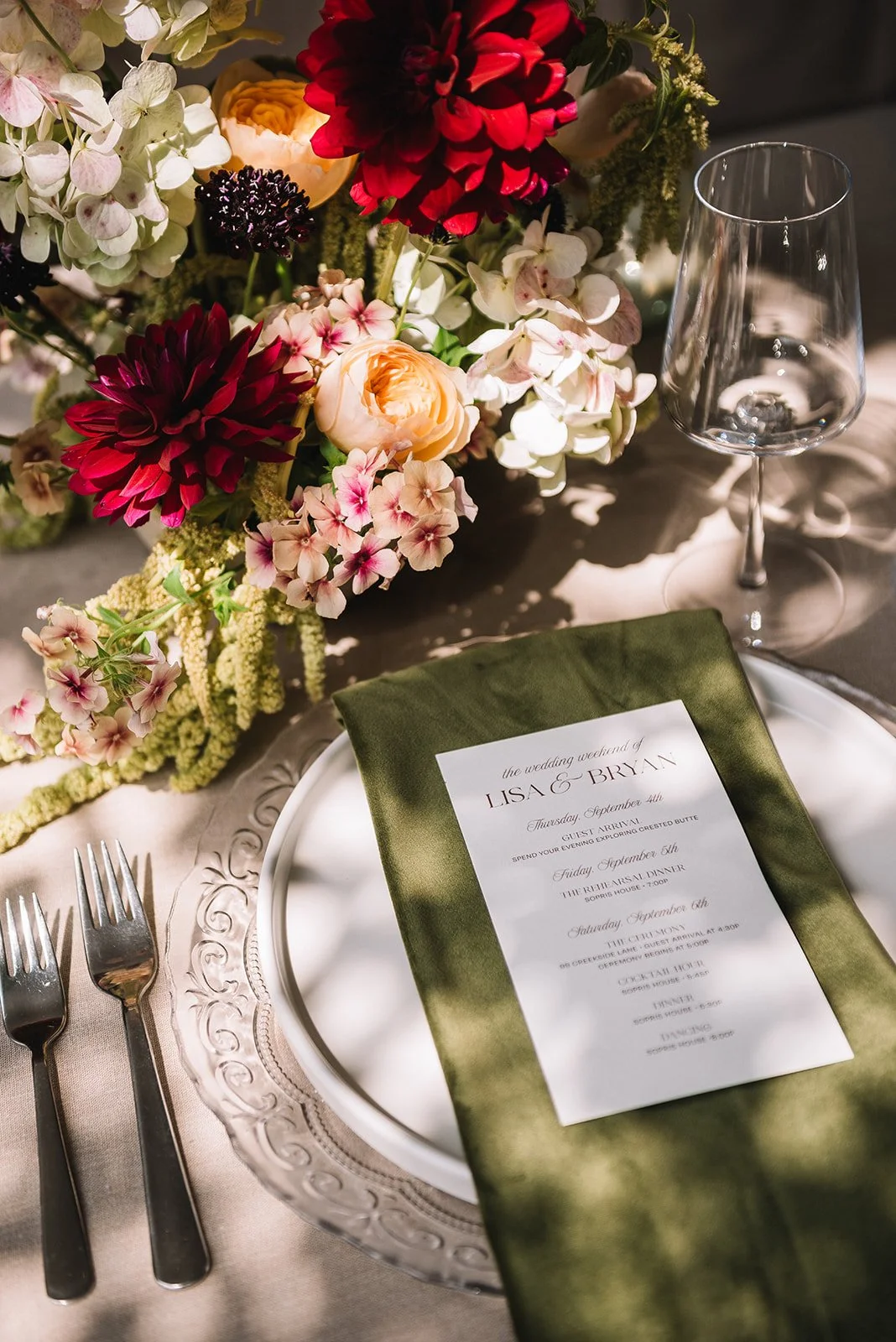 WE hope the micro-wedding trend is here to stay. Hosting an intimate party with your nearest and dearest, where you get to cheers, hug and have a conversation with each of your carefully selected humans sounds dreamy. Lisa & Bryan chose to share a place that is incredibly special for them, and that happens to be hard to get to, with their family and friends. Designs were intentional to make every detail elegant, unique and personalized; from the place settings to the floral selection and each vase. Do more with less.