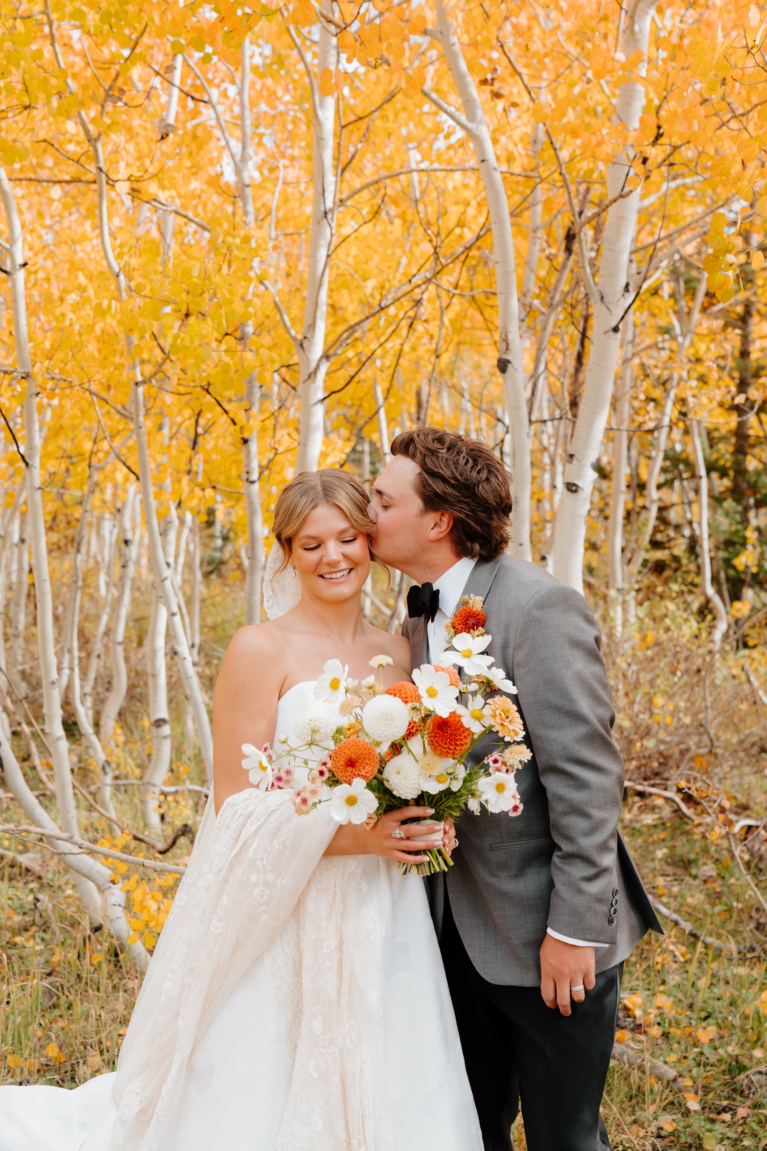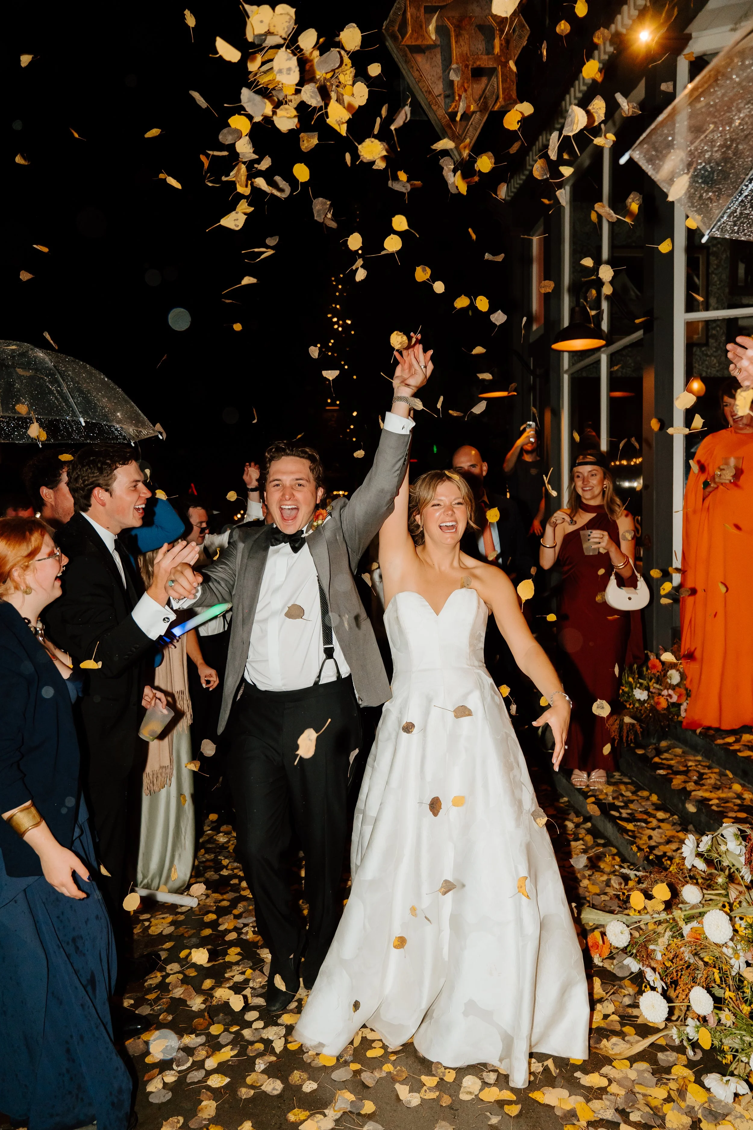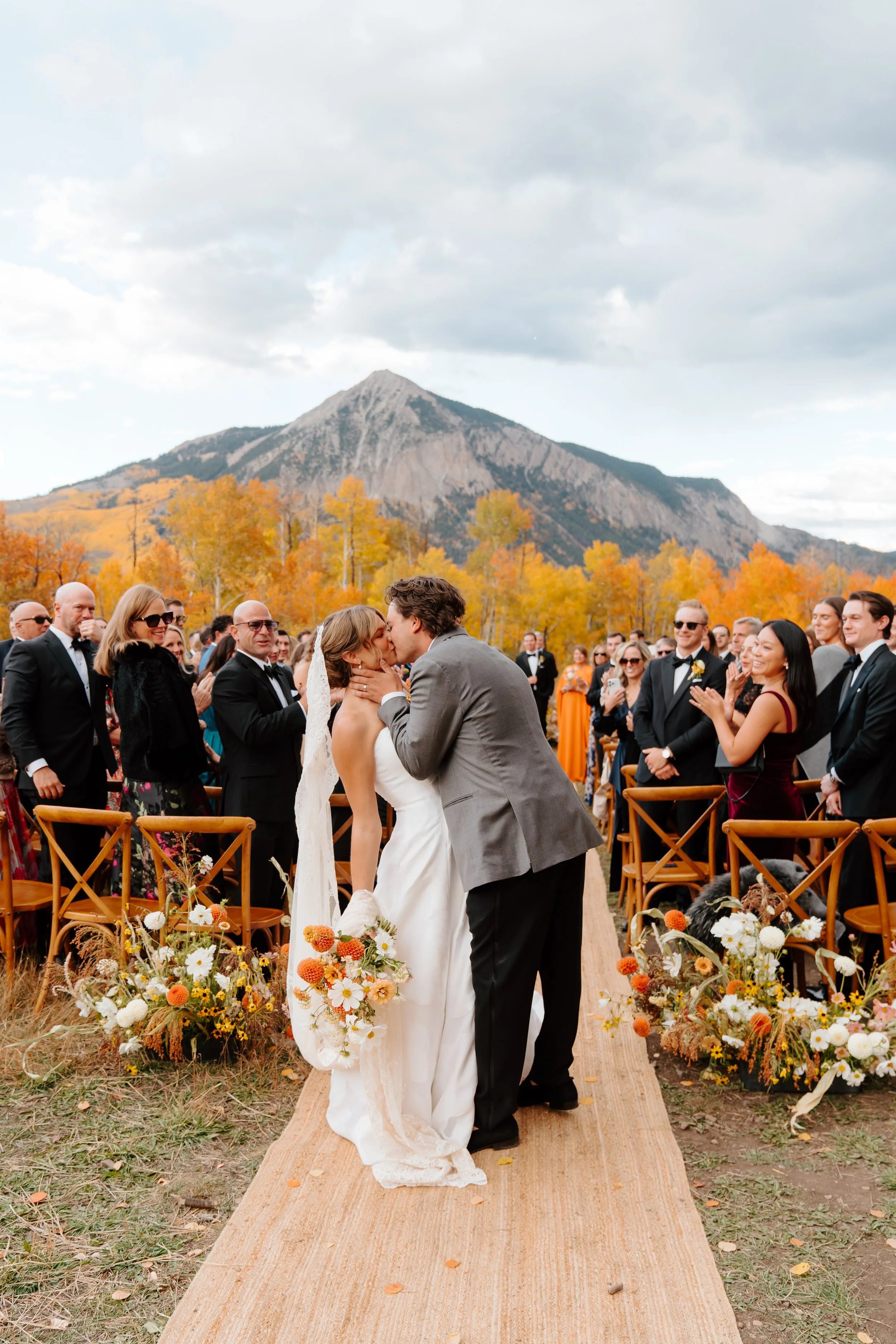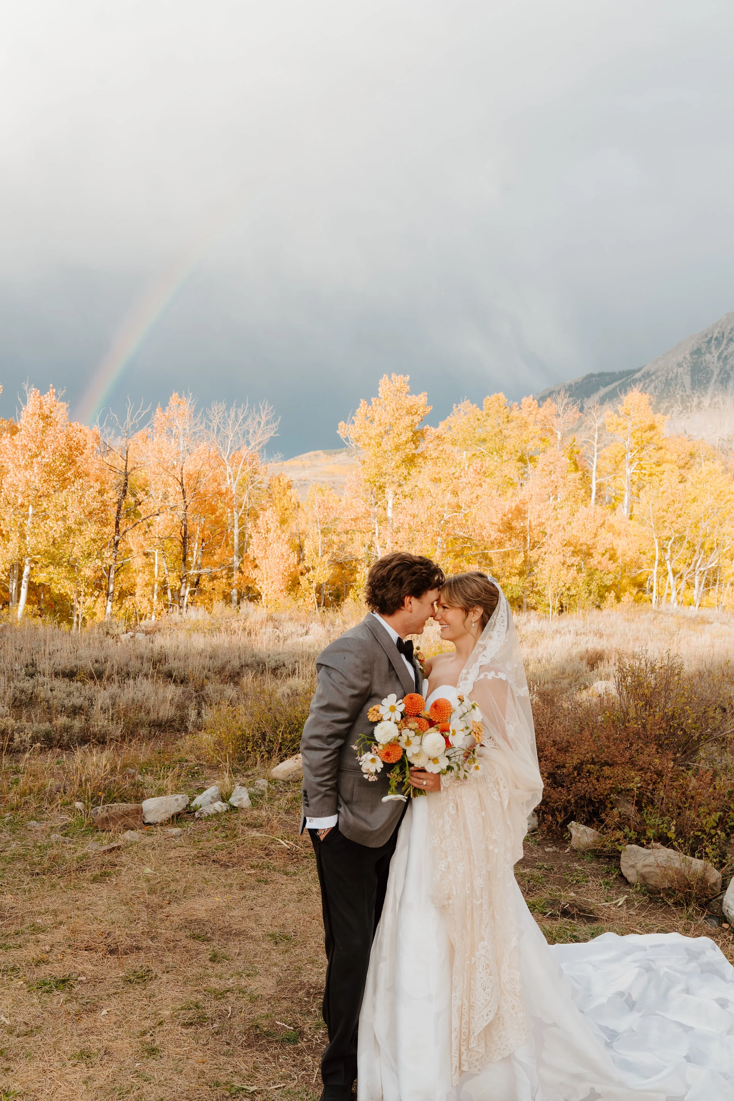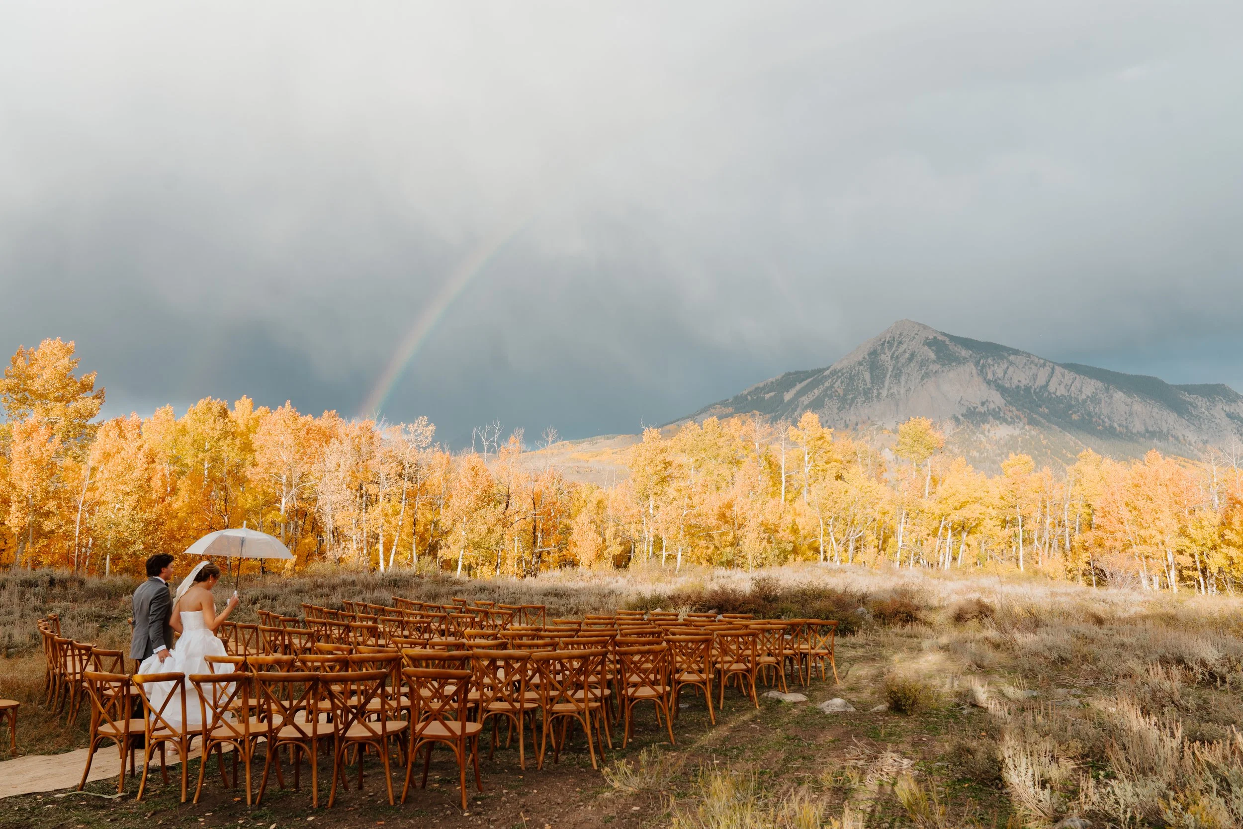 Every fall the prolific groves of aspen trees turn the world briefly gold. Morgan & Davis landed the perfect wedding weekend, their ceremony tucked among the golden leaves, blue skies for their vows and a short storm resulting in the perfect rainbow promise. While it is impossible to nail the timing with mother nature, planning your fall wedding at the end of September and early October lends itself to likely be a golden wedding weekend.